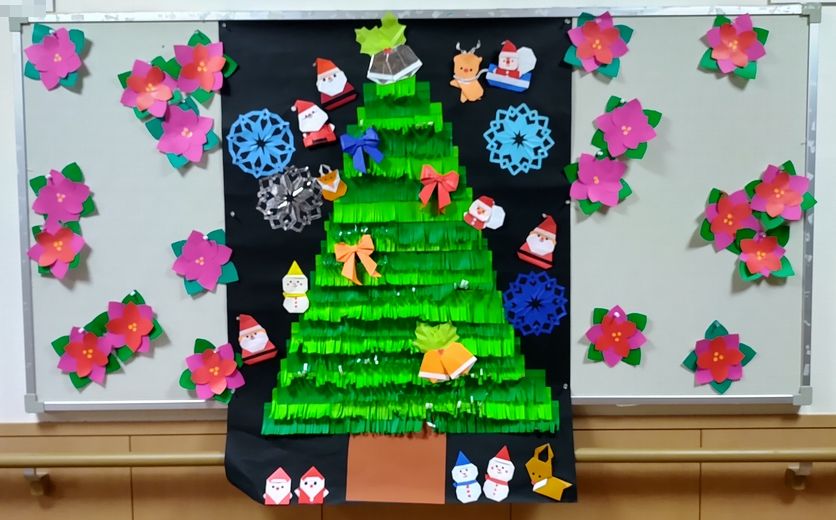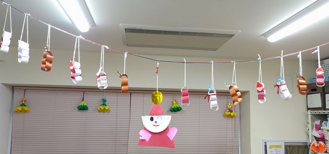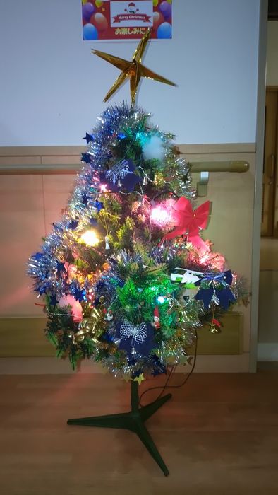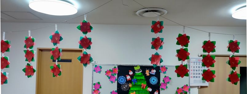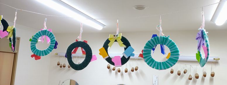 手洗いの前には、利用者さんが作ったクリスマスリースがあります。 \(^o^)/